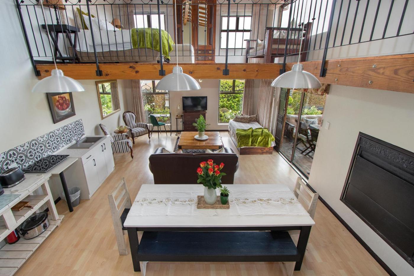Studio Apartment with Balcony. Luxury accommodation is offered in this cosy open plan, self catering unit. It features luxurious bedding and linen, a loungedining area, a satellite TV with DSTV and a fully-equipped kitchenette. A sliding door leads onto a furnished balcony. A staircase must be ascended to enter the unit. ;